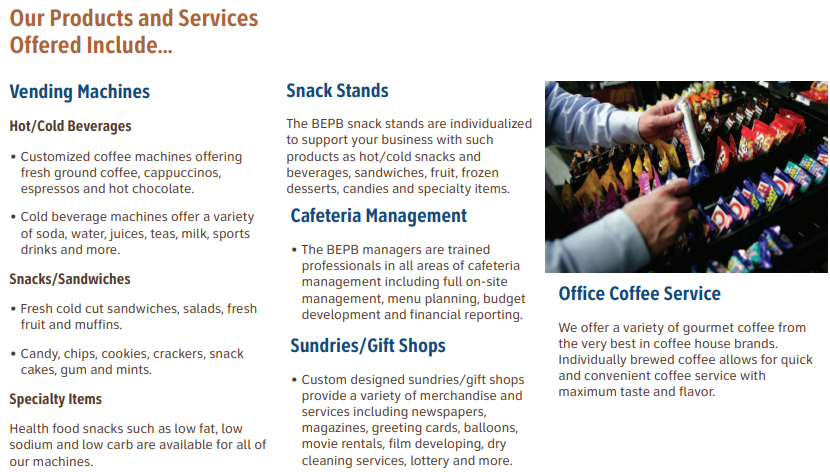 - BEPB managers have been providing professtional, ethical, and reliable food services since 1936. The managers of the BEPB are dedicated to the success of the program and in return have an aindustry low turn-over rate.